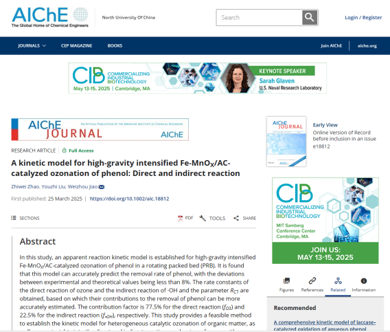 近日,我实验室焦纬洲教授团队在化学工程领域顶级期刊“AIChE Journal”上发表题为“A kinetic model for high-gravity intensified Fe-MnOX/AC-catalyzed ozonation of phenol: direct and indirect reaction”的论文。论文第一作者为硕士研究生赵志伟,焦纬洲教授为唯一通讯作者。“AIChE Journal”是美国化学工程师协会(American Institute of Chemical Engineers, AIChE)的旗舰期刊,创刊于1955年,历史悠久,以发表原创性基础研究和前沿工程应用著称,是化学工程领域的“黄金标准”期刊,被全球学术界和工业界广泛认可。