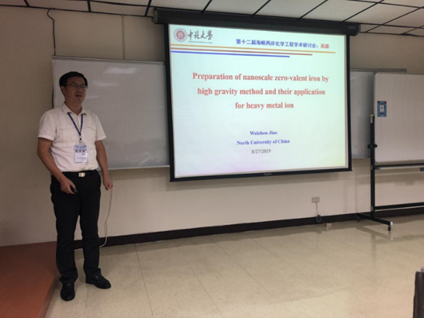 2019年8月焦纬洲教授在台湾高雄参加由台湾中山大学主办的“第十二届海峡两岸化学工程学术研讨会”,并做题为“Preparation of nanoscale zero-valent iron by high gravity method and their application for heavy metal ion”的报告。报告对超重力强化臭氧氧化过程的原理以及O3、O3/H2O2、O3/Fenton、O3/PS、催化臭氧氧化等高级氧化法处理有机废水的耦合应用进行了介绍,并对超重力技术的优势、应用前景及技术突破进行了总结和展望。